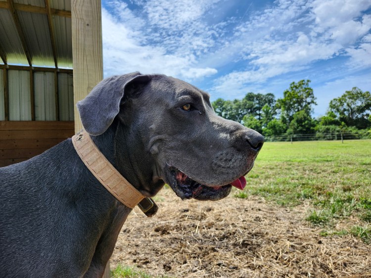 Despite the short time on the farm, he was truly able to discover how to be a dog. Upon his arrival in September of 2025, with the training we were able to provide and exposure to more animals, he was happily rehomed in October of 2025 into a household with three other great danes and plenty of land. Praying for all his happiness on the next part of his journey.